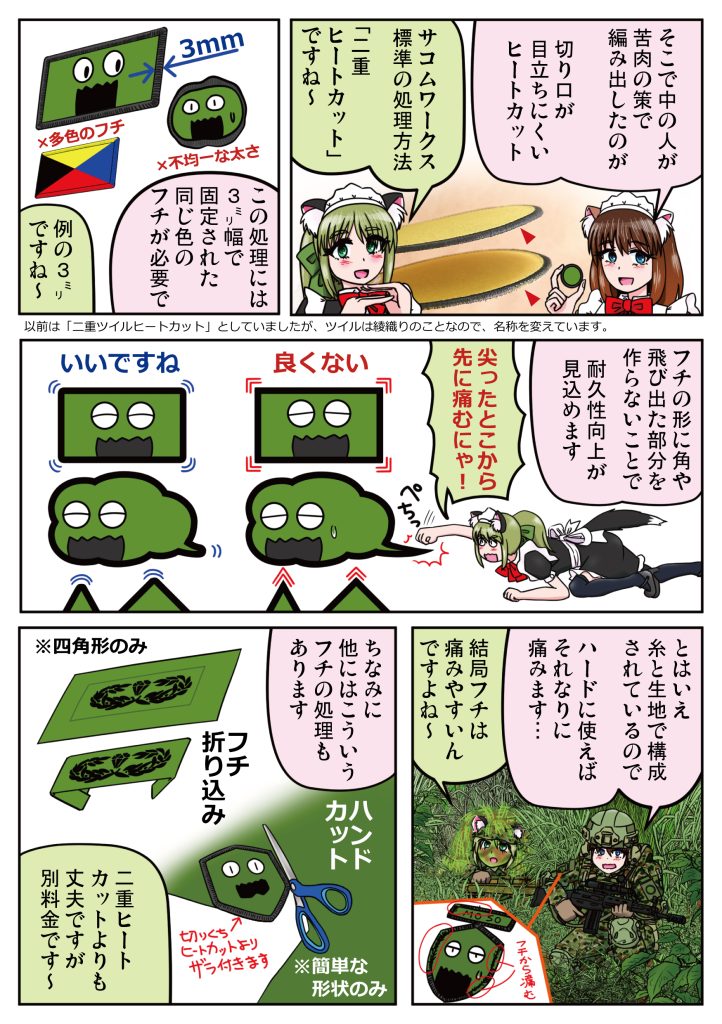 現在sacom worksでは、基本的に二重ツイルヒートカットを推奨しており、部隊の方からも強度面や仕上げで喜ばれています。