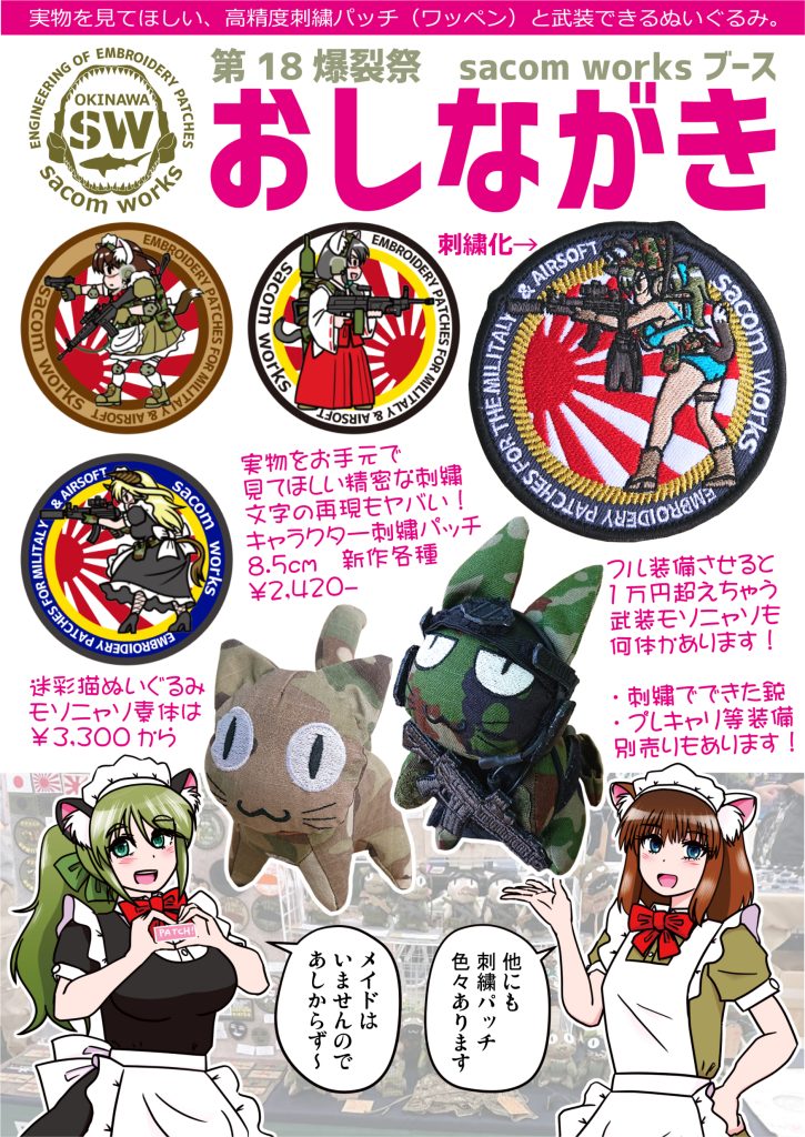 製品としては定番の刺繍パッチと、武装できる猫ぬいぐるみ「モソニャソ」を少し。
