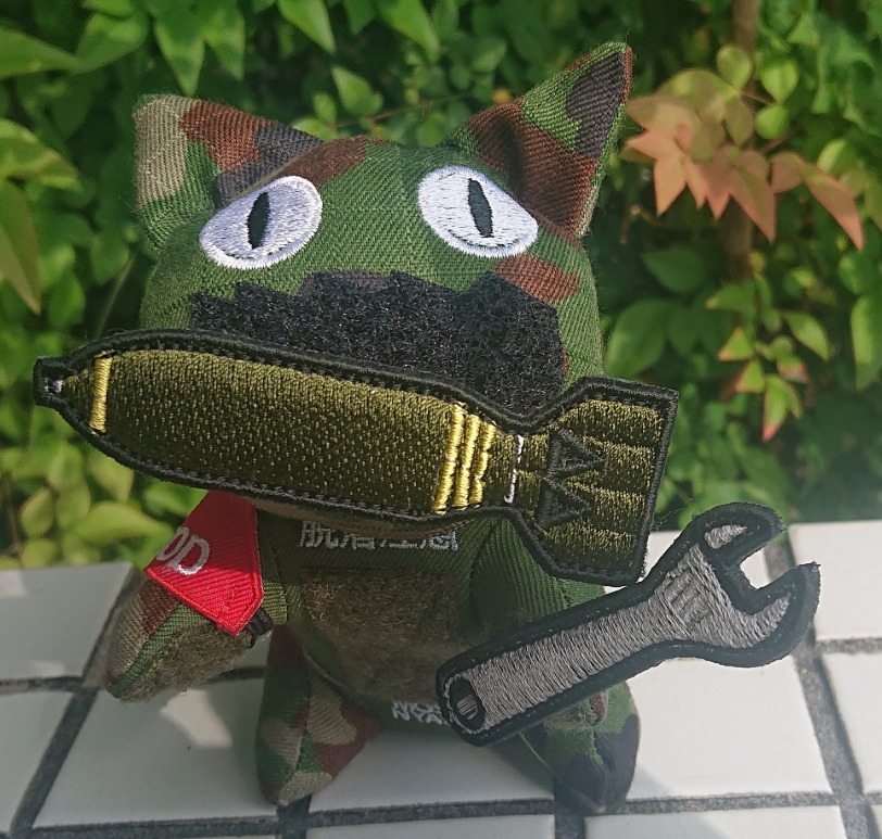 陸自祭にも出品した陸自迷彩装備勢もおります。フル装備すると1万1千円くらいになってしまうトンデモぬいぐるみですが、「刺繍パッチに刺繍パッチを重ね、さらに刺繍パッチでできたパーツを重ねる」というスタイルで製造していますので、是非ともお手にとっていただけますと幸いです。